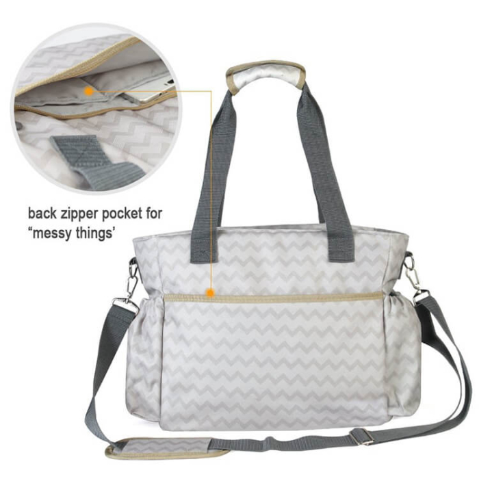 2.10 POCKET BAG + FREE CHANGING MAT – No kidding! In fact, it has 11 pockets if you count the large main compartment. 2 side pockets with draw string suitable for milk or water bottles, 2 large button down front pockets, 5 large inner pockets inside the main zipped compartment and 1 large zipper pocket at the back. This stylish toddler bag also, comes with a padded free changing mat