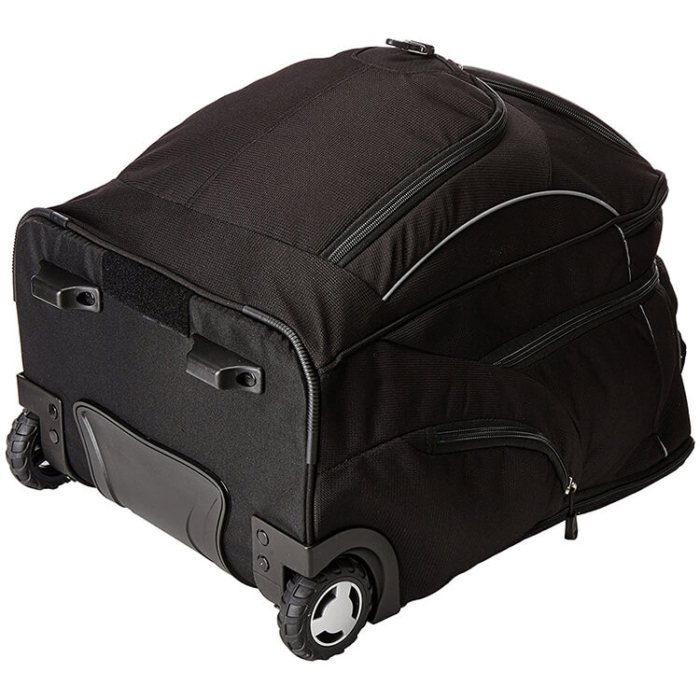 Large, zippered front compartment has premium organizer with media pocket, zippered pocket, multiple open pockets and removable key fob. Zippered accessory compartment has a headphone port. Smooth rolling, corner-mounted wheels